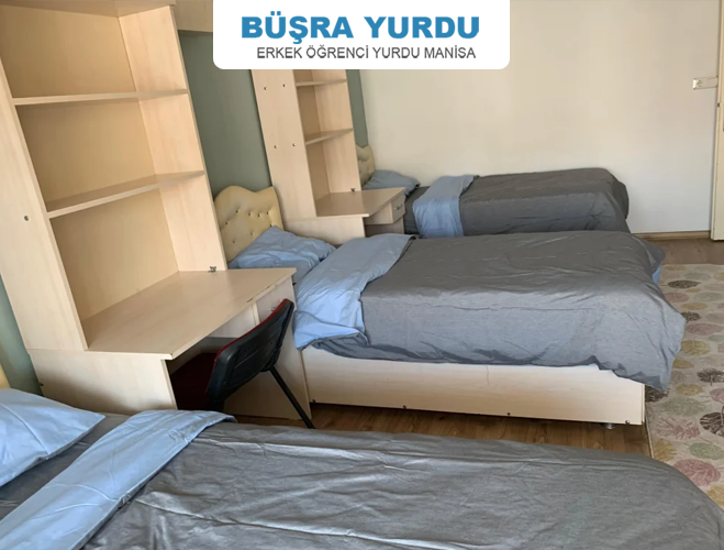 Manisa Yunusemre bölgesindeki Büşra Erkek Öğrenci Yurdu, geniş ve konforlu üç kişilik odaları ile öğrencilerine ideal bir yaşam alanı sunuyor. Her odada üç adet rahat yatak, ortak bir çalışma masası ve ergonomik sandalyeler bulunmaktadır. Ayrıca, kişisel eşyalarınızı düzenli bir şekilde saklayabileceğiniz geniş dolaplar ve kitap rafları mevcuttur. Hızlı internet bağlantısı ve her odada bulunan sıcak-soğuk su imkanları ile hem ders çalışabilir hem de rahatça dinlenebilirsiniz. Ferah ve aydınlık ortamı sayesinde, arkadaşlarınızla birlikte keyifli bir yaşam sürmeniz mümkün olacaktır.